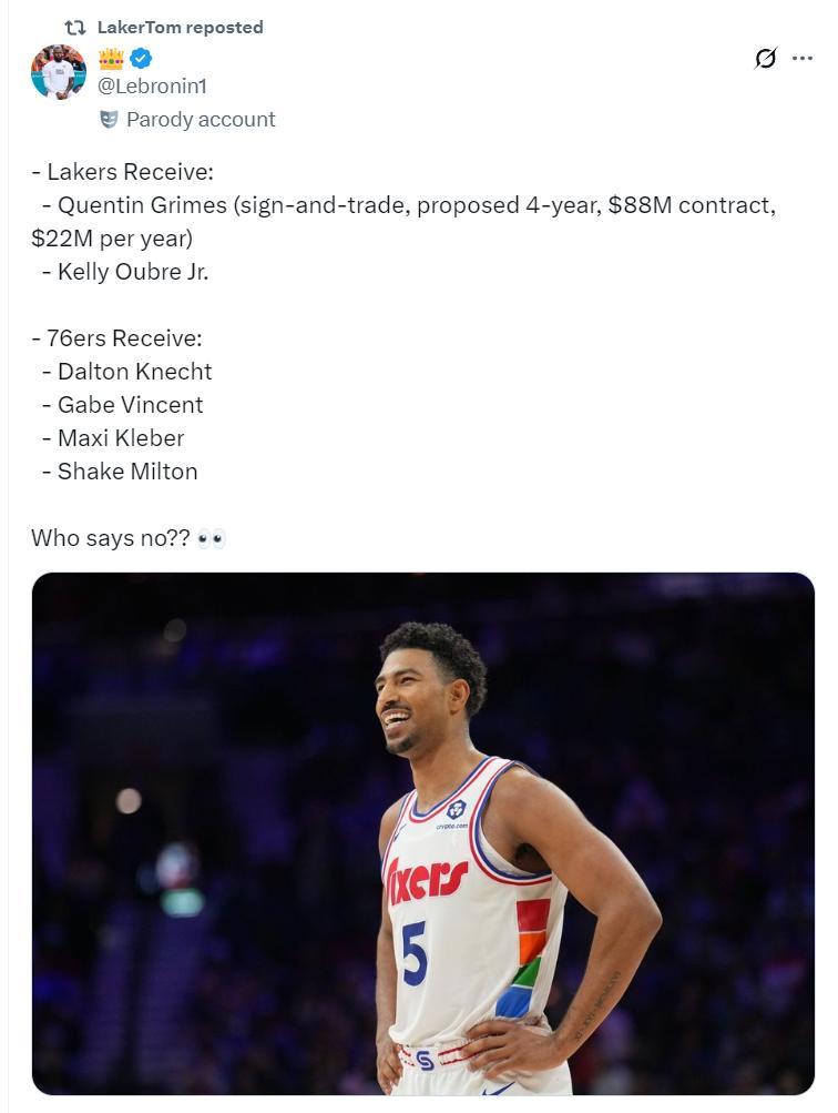 湖媒建議湖人跟費城先簽後換,用克內克特、文森特、克勒貝爾、米爾頓換格蘭姆斯(四年8800萬)、烏佈雷。如此一來湖人補充一個二號位與一個三號位。
