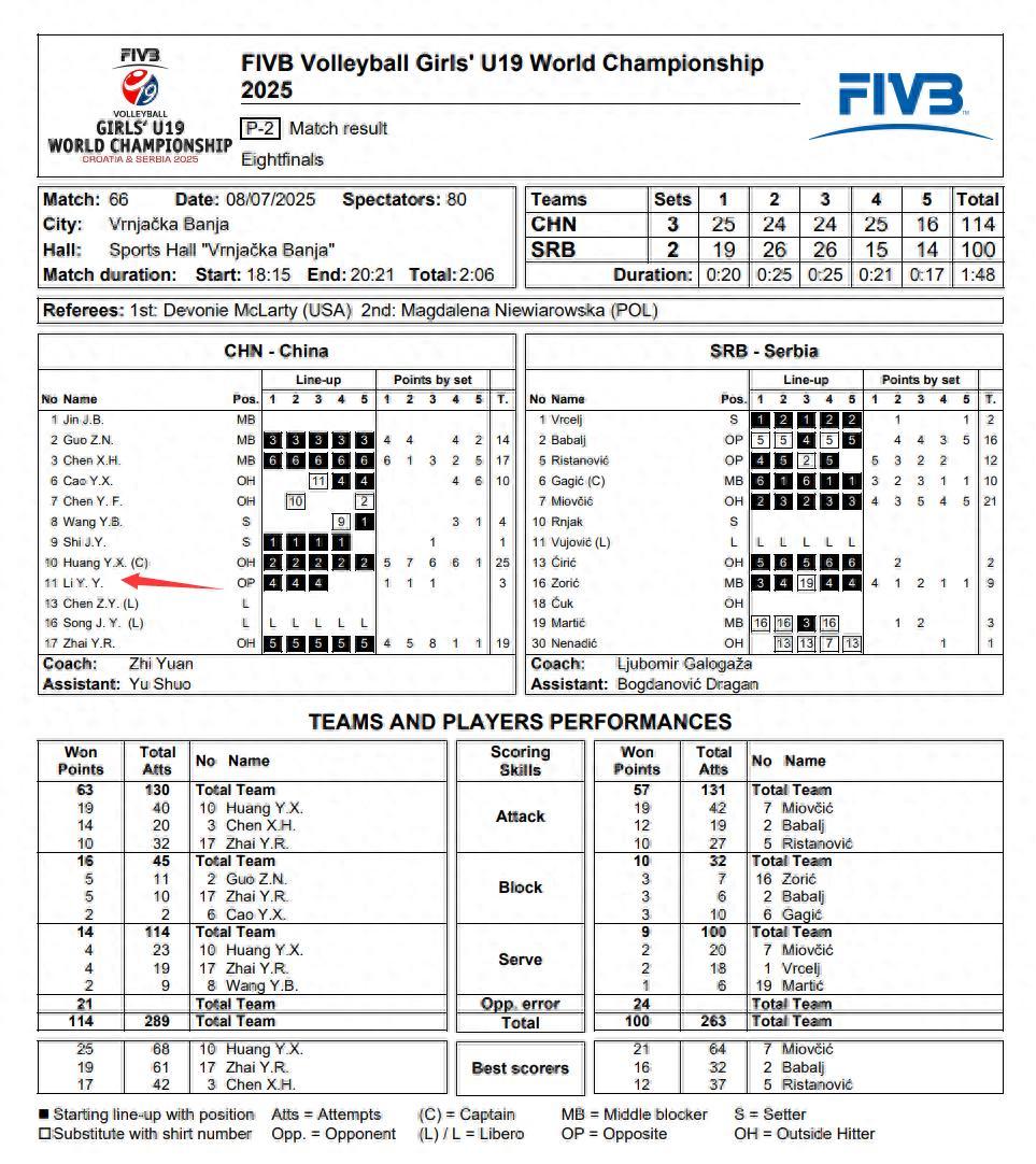 北京時間7月9日,U19女排世錦賽,中國隊3-2擊敗塞爾維亞隊晉級八強,五局比分:25-19、24-26、24-26、25-15、16-14。在大比分1-0的情況下連丟兩局,好在第四局與決勝局袁志棄用了先發接應李一依讓曹燁軒主打才完成逆轉。