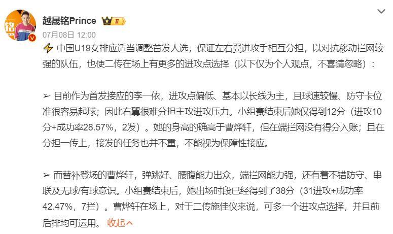 還有大V寫道:首發接應李一依,進攻點低以長線爲主,且球速較慢,她比曹燁軒好的地方就是身高,可她防守端攔網根本下不了分,在分擔一傳上也沒有接發任務做不了保障性接應。