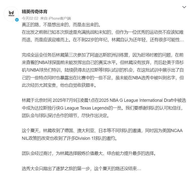 林葳剛剛被德克薩斯傳奇隊在第八順位選中,感謝球隊的認可和信任,團隊會與球隊探討合作的細節儘快作出決定。這個夏天,林葳收到了德國、澳大利亞、日本等不同球隊的邀請,同時因爲美國NCAA NIL政策的改變也收到了許多Division 1球隊的邀約。團隊會經過商討,爲林葳選擇鍛鍊價值最大、綜合能力提升最多的選擇。
