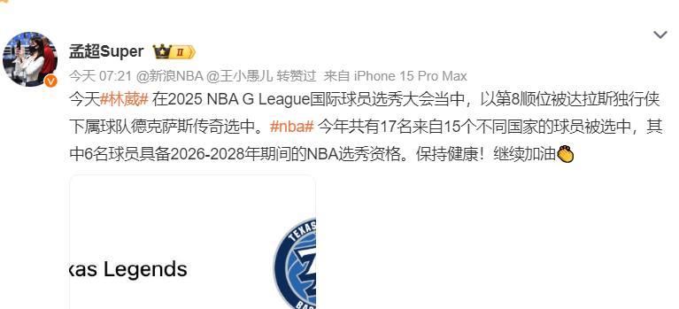 北京時間7月9日,NBA G聯賽國際球員選秀,中國球員林葳被達拉斯獨行俠下屬球隊德克薩斯傳奇隊在第八順位選中。今年有17位國際球員被選中遠高於去年,林葳也終於獲得海外聯賽征戰的資格,南京同曦發來賀電。