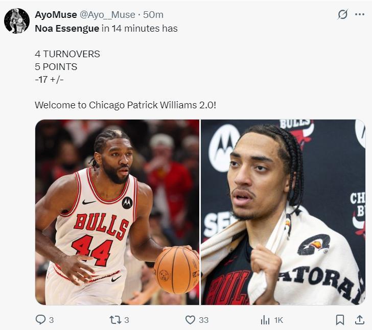 公牛記者Bolliver:球迷們如果你們覺得帕威在公牛的表現不佳,那麼你們應該看看諾阿-埃桑格的表現他更差。