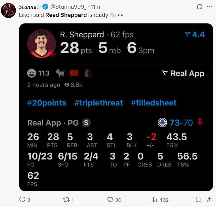 第三節謝潑德是大爆發,單節9中5,三分7中3,拿到13分1籃板2助攻1搶斷1蓋帽,火箭一度都落後快船10分完完全全是依靠謝潑德一人打回來的,三節打完他已經28分5籃板4搶斷3助攻3蓋帽。