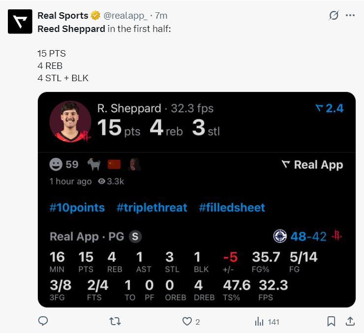 次節快船一度拉開到8分,謝潑德連續命中兩個三分球還持球突破連拿8分扳平差距。半場打完謝潑德16分鐘,14中5,三分8中3,拿到15分4籃板1助攻3搶斷2蓋帽,效率雖然不佳但數據很全面。