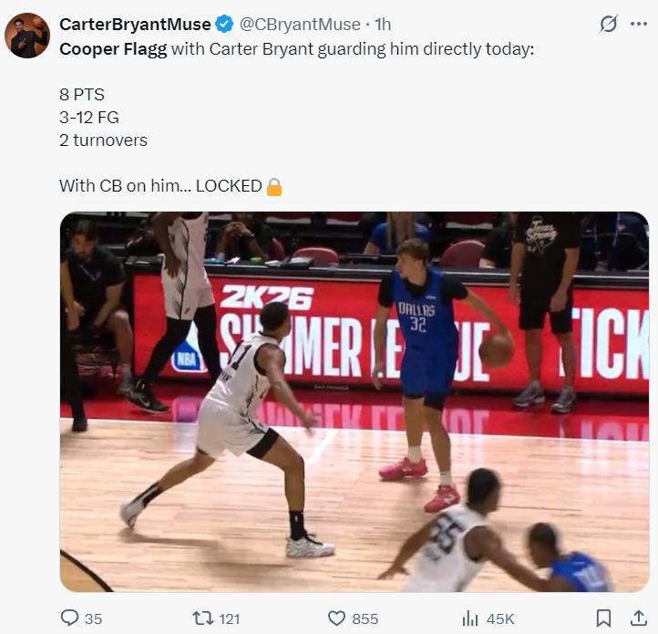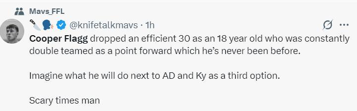 弗拉格的球迷寫道:18歲的弗拉格擔任控球前鋒多次被包夾,依舊高效拿下30+,他此前從未打過一號位。想象一下當他與歐文、濃眉、克萊同隊時的場景那得多可怕啊。