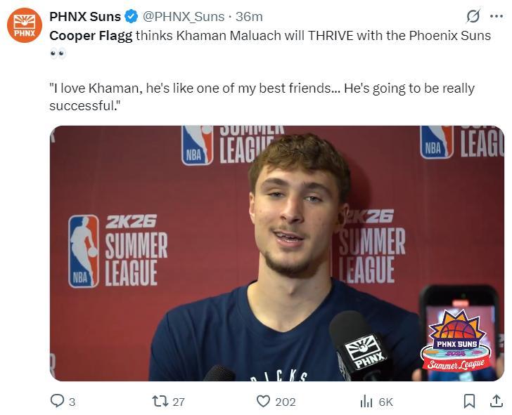 弗拉格在賽後也談到了自己杜克大學隊友馬魯阿奇(10號秀):“馬魯阿奇是我最好的朋友,我愛他,他未來一定能非常的成功。”