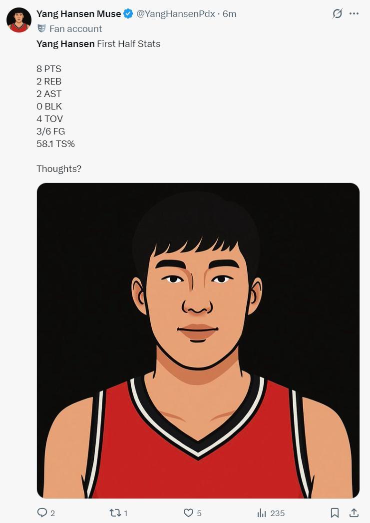 小楊登場被犯規後隨手一挑命中,但裁判給了不算全場噓聲。小楊被換下休息後開拓者0-6暫停。全場比賽楊瀚森10分5籃板3助攻1蓋帽5失誤,命中率50%,他貢獻了一次隔扣與一次補釦。