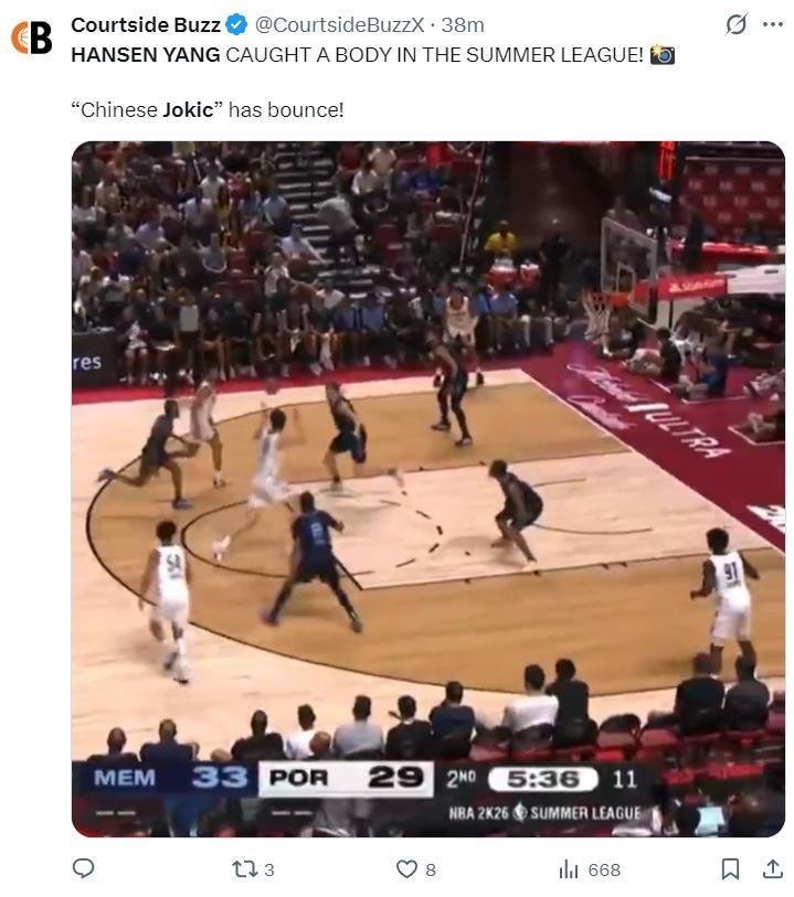 美媒CB寫道:楊瀚森夏聯完成了隔扣,中國約基奇展現了他的彈跳能力。