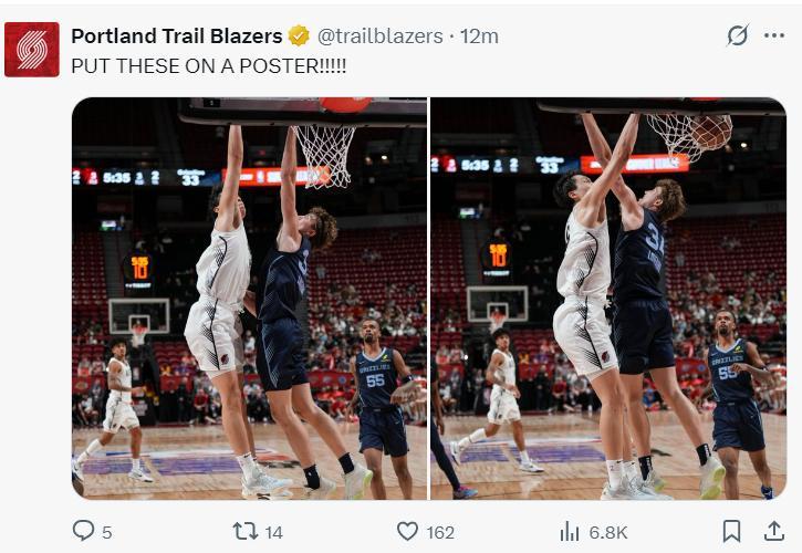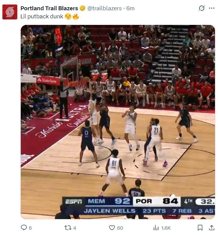 開拓者官方也曬出了楊瀚森完成補釦的瞬間,這場比賽楊瀚森依舊亮點滿滿。
