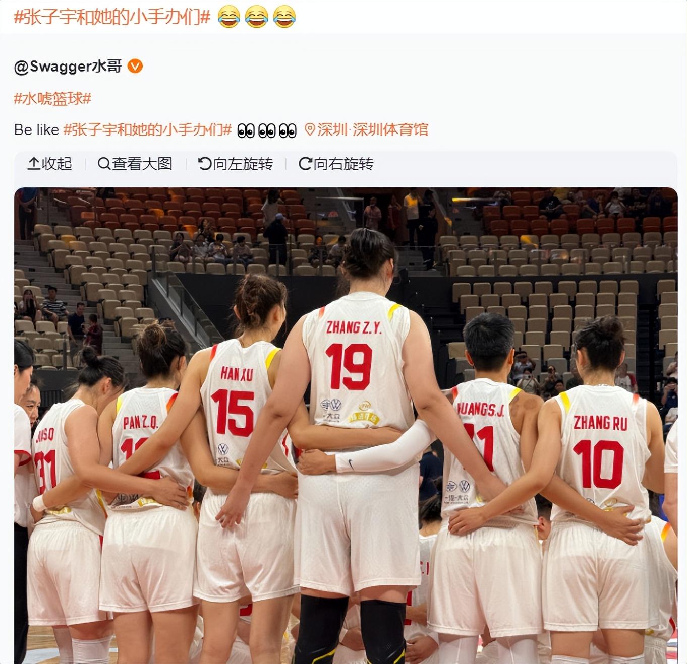 末節張子宇還剩1分33秒與韓旭搭檔雙塔,全場比賽張子宇12分鐘,7中5,拿到13分4籃板2助攻1蓋帽,命中率71.4%。張子宇和她的小手辦們還成爲了熱詞,因爲全隊跟張子宇一起站着時都非常袖珍超可愛。