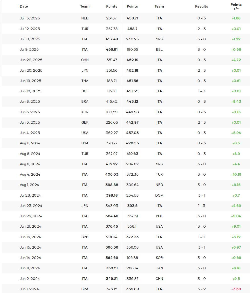 從世界排名積分上能看到,意大利女排上一次在國際大賽上輸球還要追溯到2024年6月1日,當時2-3不敵巴西,緊接着2024年6月2日-2025年7月13日足足406天未嘗一敗,期間是26連勝,世界第一硬實力真的太強。