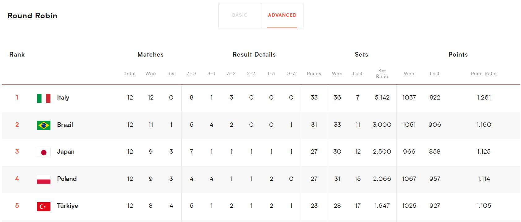 排在第二名的巴西女排是11勝1負,巴西、意大利是本屆世聯賽唯二拿到至少11勝的球隊,後面的球隊最多隻能拿到10勝。