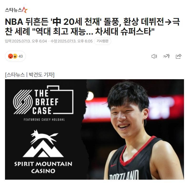 韓國媒體《AFPBnews》髮長文盛讚楊瀚森——20歲的天才震撼NBA,出道就獲天資卓絕讚譽“史上最高天賦”,新一代的超級巨星。
