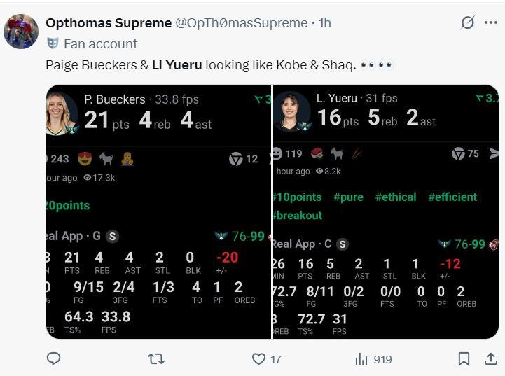 美國球迷盛讚佩奇與李月汝就像是科比與奧尼爾一般,這兩人合計拿到37分佔比全隊總得分44.6%。