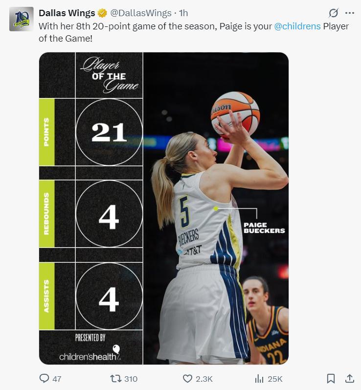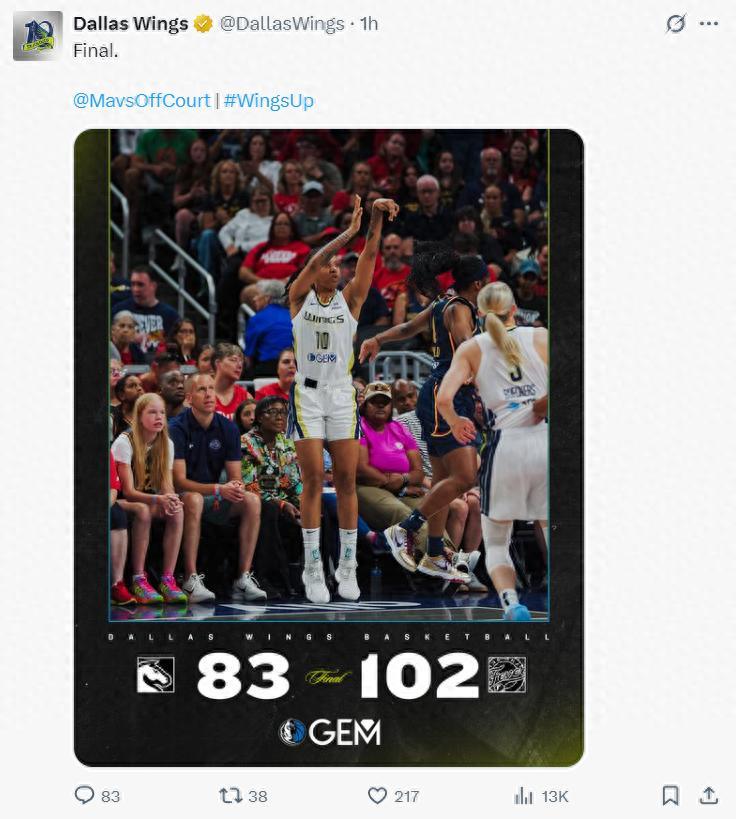 北京時間7月14日,WNBA常規賽,達拉斯飛翼83-102慘敗印第安納狂熱。這場比賽狂熱全隊5人得分上雙,球隊的命中率超過51%,而飛翼的命中率爲47.8%,而且飛翼全隊17次失誤被狂熱多次輕鬆反擊。