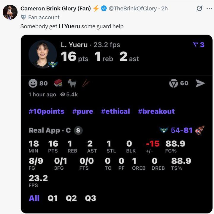 美記:李月汝繼續表現出色26分鐘拿到16分,但她還需要增強體能這樣內線的防守才能更出色。