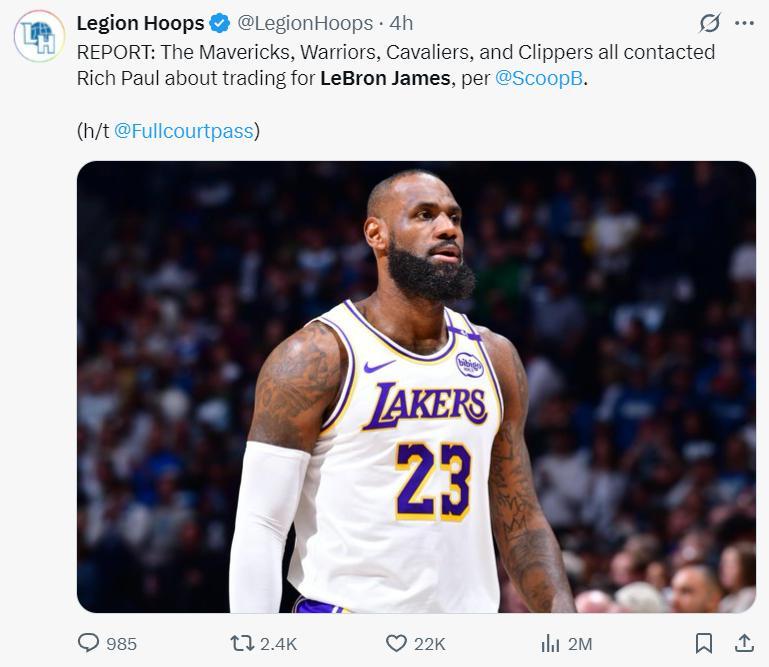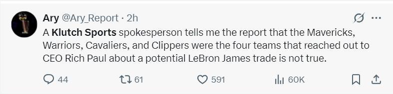 兩小時後,美記Ary闢謠:一位Klutch Sports的發言人告訴我,有關獨行俠、勇士、騎士和快船這四支球隊聯繫CEO 裏奇-保羅,探討交易勒布朗-詹姆斯的報道並不屬實。