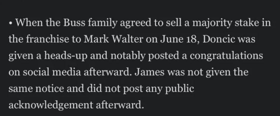 此前ESPN的蕾夢娜-謝爾伯恩與布萊恩-文霍斯特在長文中寫道:“湖人出售球隊告知了東契奇,但沒有告知勒布朗。”