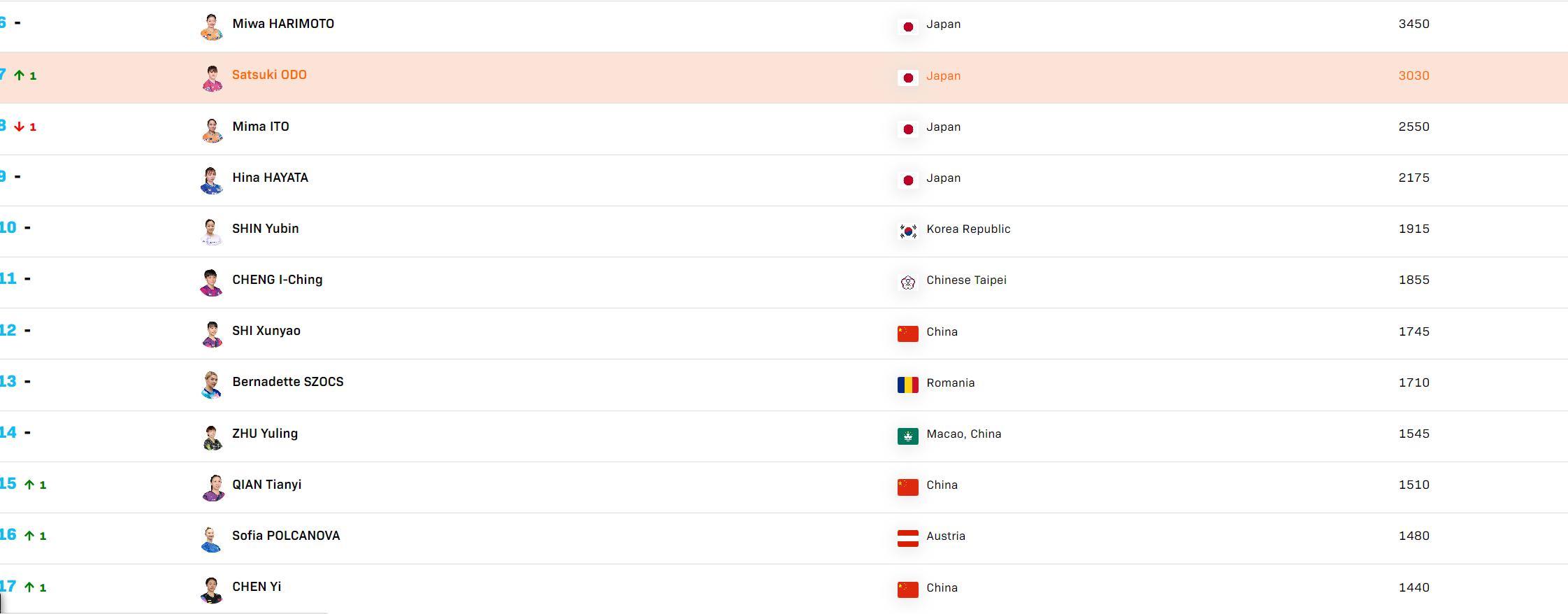 陳熠4-3早田希娜(世界第九)【6-11,9-11,5-11,11-9,11-7,11-2,11-9】 ;