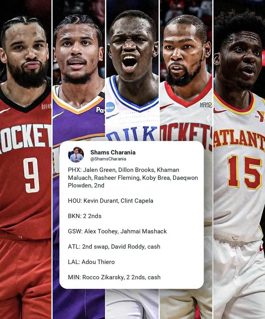 菲尼克斯得到:杰倫-格林、狄龍-布魯克斯、卡曼-馬盧阿奇、拉希爾-弗萊明、科比-佈雷亞、戴奎恩-普洛登、2個次輪籤;休斯敦得到:凱文-杜蘭特、克林特-卡佩拉;
