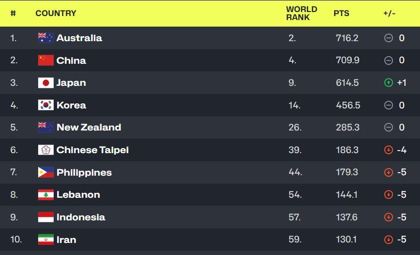 澳大利亞世界排名第二,黎巴嫩世界排名第54差距巨大。