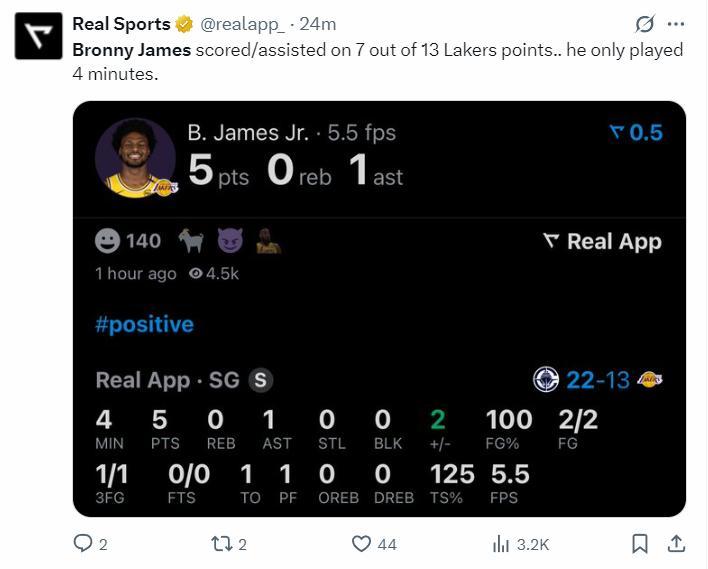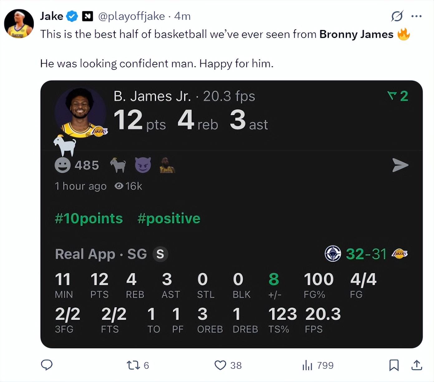 湖人前13分里布朗尼一人拿到5分+1助攻,短短4分鐘布朗尼幫助球隊拿到了7分,他得分+助攻超過全隊一半。