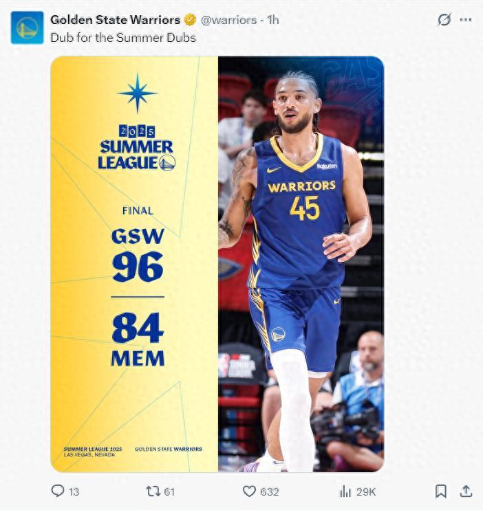 北京時間7月16日,NBA夏季聯賽,勇士96-84大勝灰熊。這場比賽勇士在首節落後9分的情況下完成逆轉,第二節打完已經扳平分差,第三節完成反超,末節拉開分差直接收割比賽。