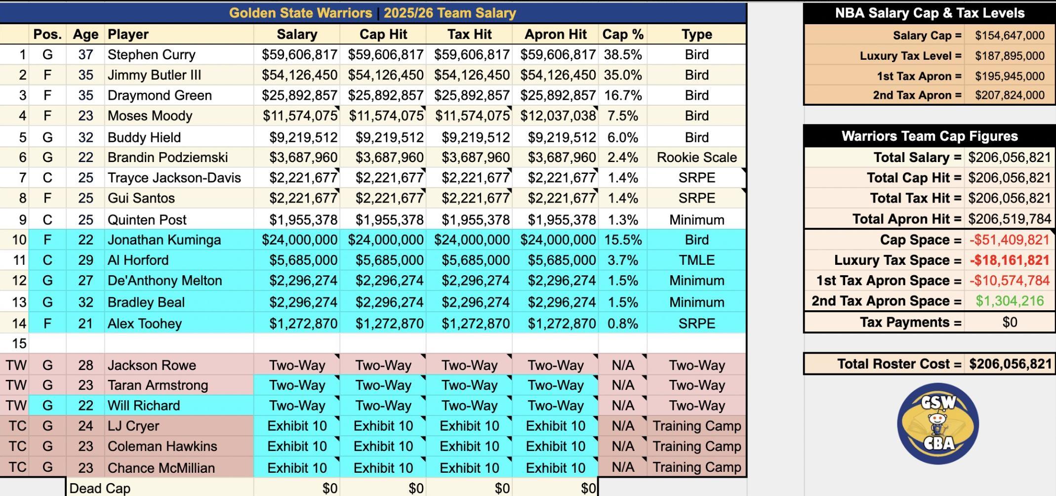 這樣勇士隊就可以湊齊一套14+3名單,雖然這套14+3名單看起來競爭力也嚴重不足,但總比如今的死亡三老的陣容看起來更充盈一些。