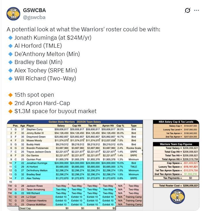 但如果能同時簽下比爾、梅爾頓、霍福德總比沒有好,因爲目前勇士隊大名單上還只是9+1名單,庫明加雖然給了790萬的資質報價但他還是受限制自由球員,他還沒確定迴歸勇士。