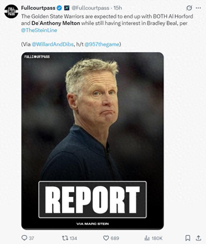 北京時間7月16日,《紐約郵報》記者馬克-斯坦恩透露,金州勇士隊有希望同時簽下艾爾-霍福德、丹東尼-梅爾頓,除此之外他們還對買斷後的布拉德利-比爾感興趣。
