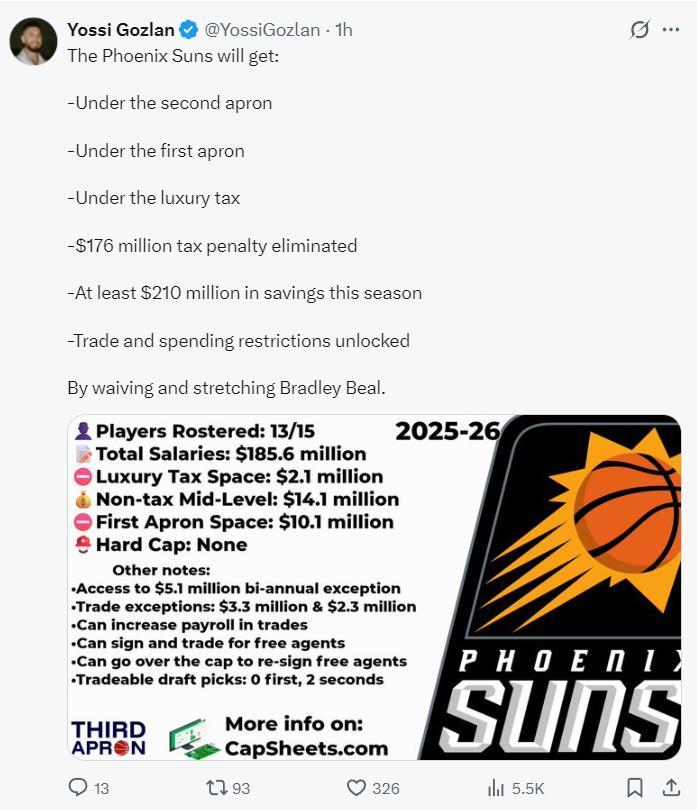 薪資結構專家Yossi Gozlan的分析,通過用延伸條款來裁掉比爾已經成功的規避奢侈稅重罰以及薪資限制在土豪線以下,球隊未來可以通過交易選秀權節省支出,新賽季太陽可以減少1.76億的奢侈稅,合計可以減少2.1億美元左右的開支。