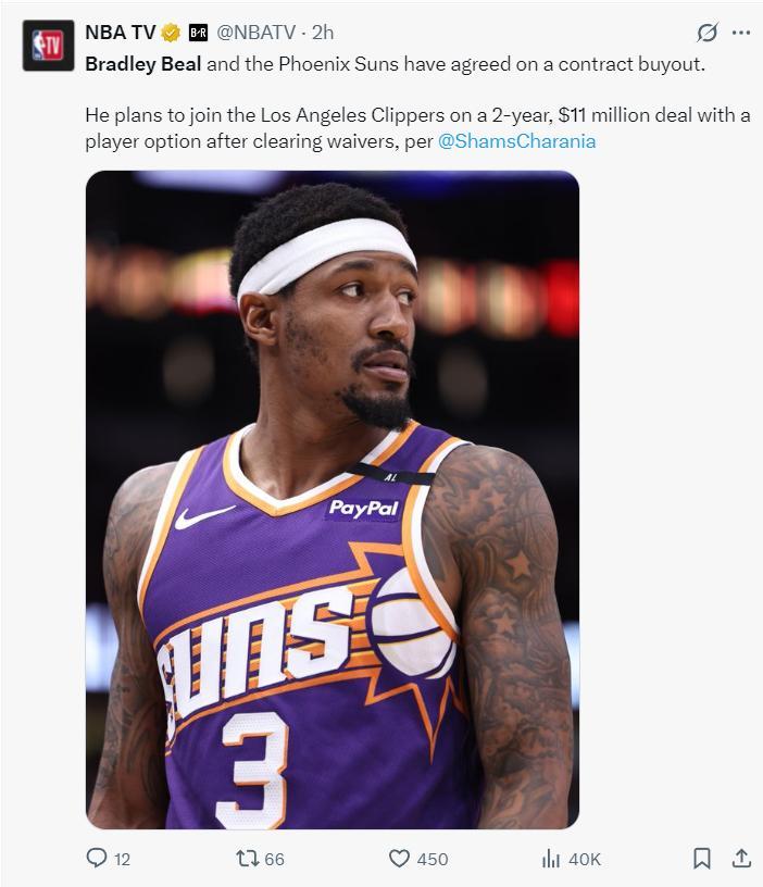 北京時間7月17日,根據ESPN的報道,比爾與太陽達成買斷,比爾將在度過澄清期後以兩年1100萬的合同簽約洛杉磯快船,快船以如此低廉的價格簽下比爾很明顯是大贏家,但對於太陽這支進入全新時代的“重建”球隊來說也不算輸。