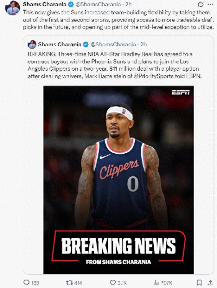 北京時間7月17日凌晨,ESPN名記Shams透露,菲尼克斯太陽隊與布拉德利-比爾達成買斷協議,他將在度過澄清期後與快船簽約,他與快船簽約的合同是兩年1100萬,比爾在與太陽買斷的過程中主動放棄了1380萬美元(接近1390萬),這才使得太陽能用延伸條款將他裁掉,他剩餘的薪水將分爲五年發放。