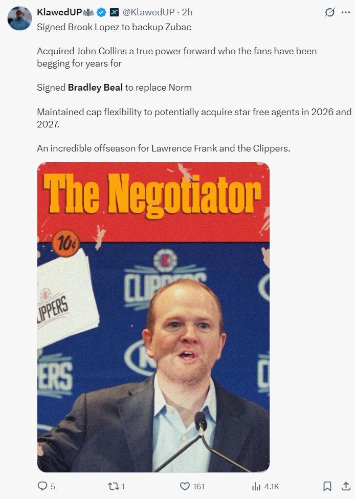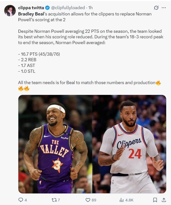 快船媒體寫道:我們簽下比爾後能充分彌補鮑威爾的空缺,儘管鮑威爾場均是22分,但在他的得分角色下滑後快船戰績更佳,賽季末快船18勝3負,鮑威爾場均只有16.7分,比爾只要能繼續場均17分快船就已經很滿足。