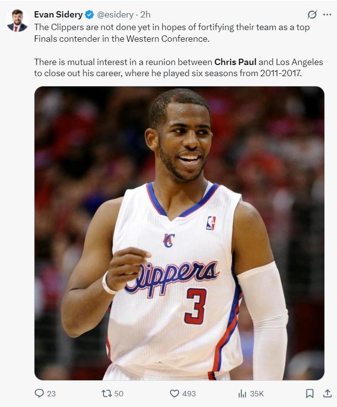 根據《福布斯體育》記者埃文-斯迪瑞的報道,快船在簽下比爾後也沒有放棄對40歲老將克里斯-保羅的追逐,他們希望繼續提升球隊實力,以便於在西部成爲總冠軍爭奪者,保羅在快船打了6個賽季,他也希望在洛杉磯延續生涯+退役。