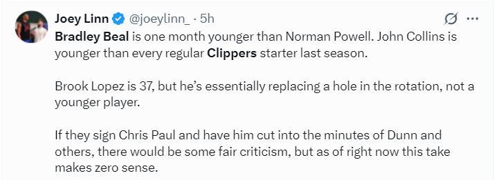 美媒Clutchpoints也力挺快船,在快船簽下比爾後這支球隊將是洛杉磯的全明星球隊——哈登、比爾、倫納德、科林斯、祖巴茨,湖人的陣容已經遠不如他們,只要這支快船能保持健康恐怕很難有球隊可以阻止他們。