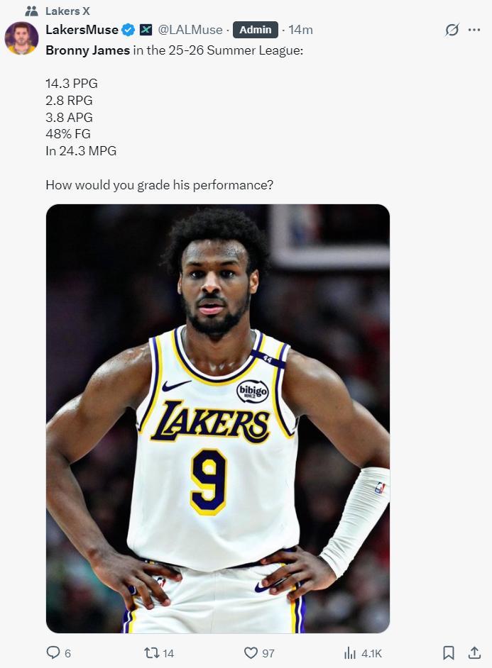 湖媒曬出布朗尼拉斯維加斯夏聯數據,場均24.3分鐘14.3分3.8助攻2.8籃板,命中率48.3%,(注意這裏沒有算鹽湖城夏聯,如果算上鹽湖城夏聯的話場均只有9.8分)
