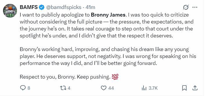 布朗尼一直都在努力訓練,不斷進步,像所有年輕球員一樣追逐自己的夢想,他應該得到支持而非負面的評價,我之前對他的看法是錯誤的,今後我會正確看待,向你致敬,布朗尼,繼續努力吧。