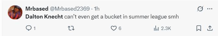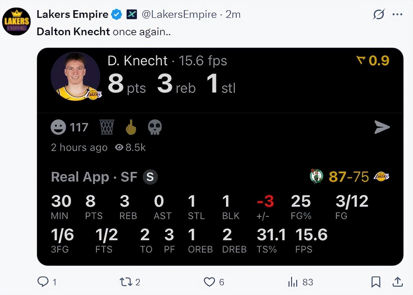 本該是夏聯湖人領袖的克內克特30分鐘,12中3,三分6中1,罰球2中1,拿到8分3籃板0助攻1搶斷1蓋帽,命中率25%,三分命中率16.7%,真實命中率31.1%。