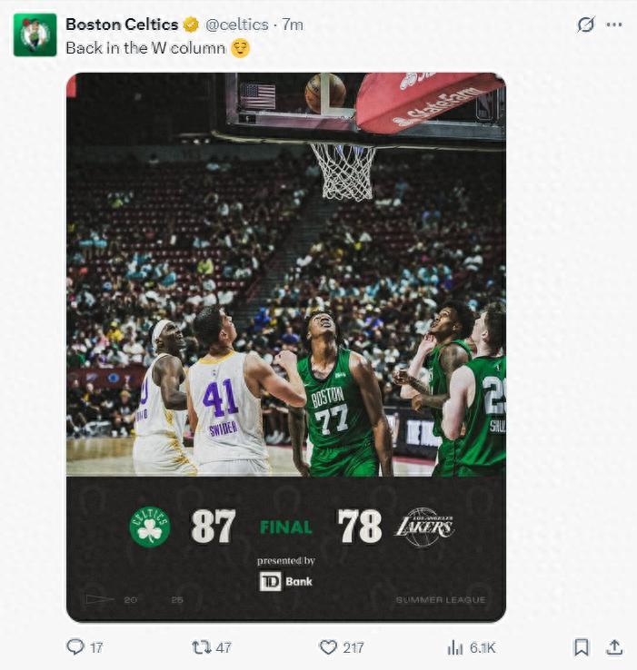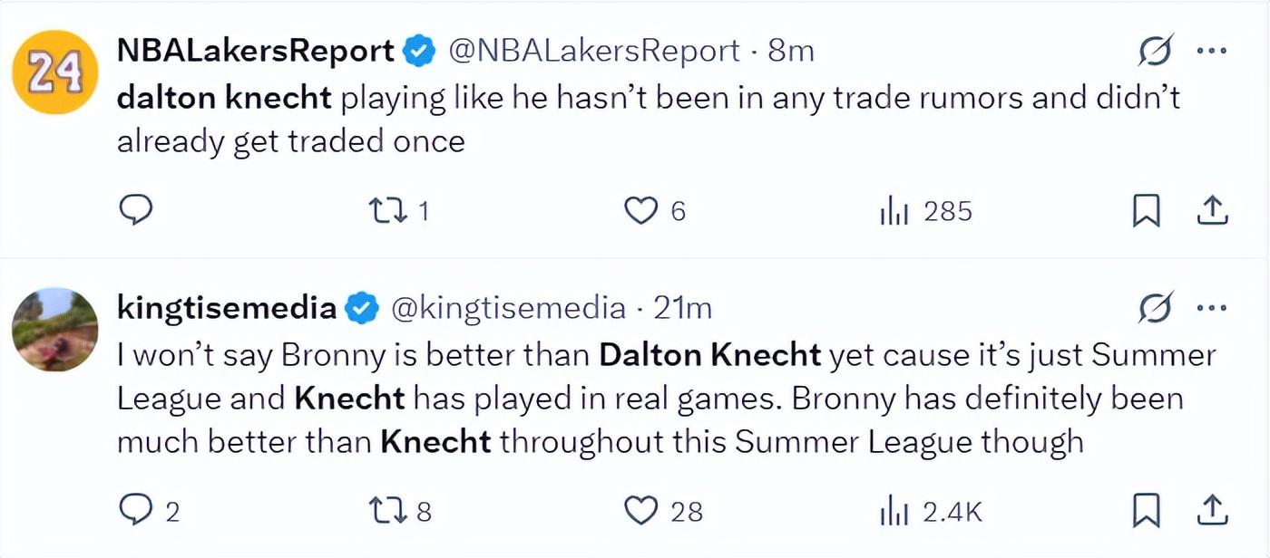 湖媒:克內克特這個表現好像湖人從未要交易似的。或許我們不能說布朗尼一定比他更強因爲這只是夏聯,但只看夏季聯賽的話,布朗尼比克內克特出色得多。