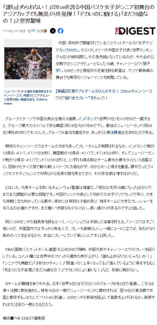 就連日本媒體預熱這場中日大戰都看衰日本隊,日媒《Digest》撰文——2.26米的中國籃壇新星第一次登上成年組比賽就打出“無雙表現”,明明很高大卻纔18歲,誰也無法阻擋她,張子宇已經讓世界爲之驚歎。