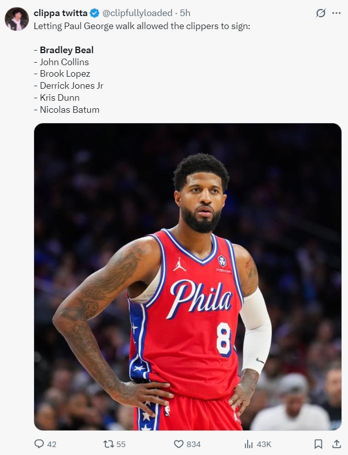船媒也致謝了保羅-喬治,他寫道:保羅喬治四年2.12億轉投費城後,快船得到比爾、科林斯、大洛、小德里克-瓊斯、克里斯鄧恩、巴圖姆等人。