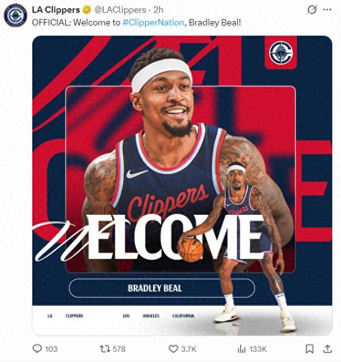 快船隊還製作了比爾生涯奇才-太陽27秒的精彩集錦來歡迎他,比爾新賽季會成爲球隊的先發SG,他可以與好友詹姆斯-哈登並肩作戰。
