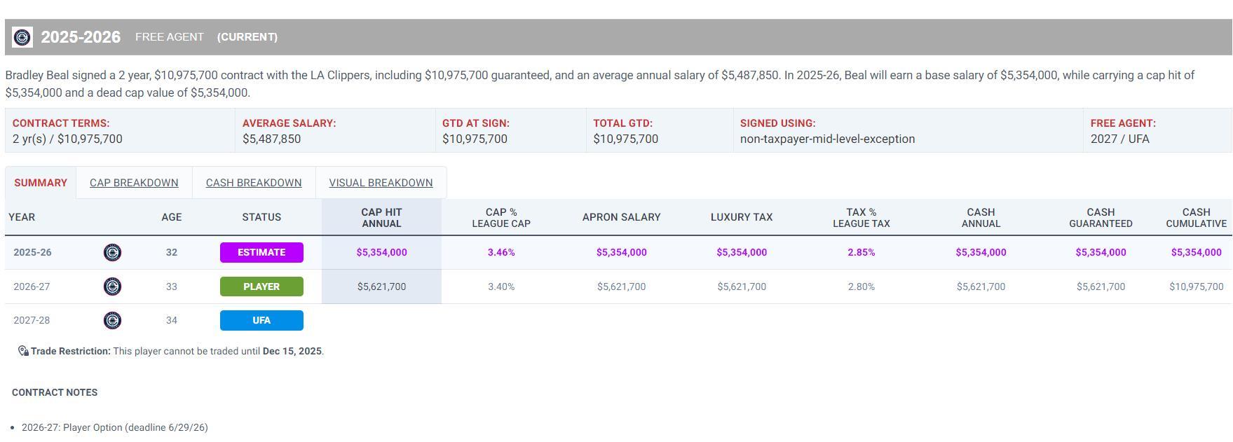 比爾兩年合同的細節也出爐了,兩年爲1097萬,25-26賽季535萬、26-27賽季562萬(球員選項),比爾只要下賽季打的出色,他明夏跳出合同後還可以爭取更多額度的合同。
