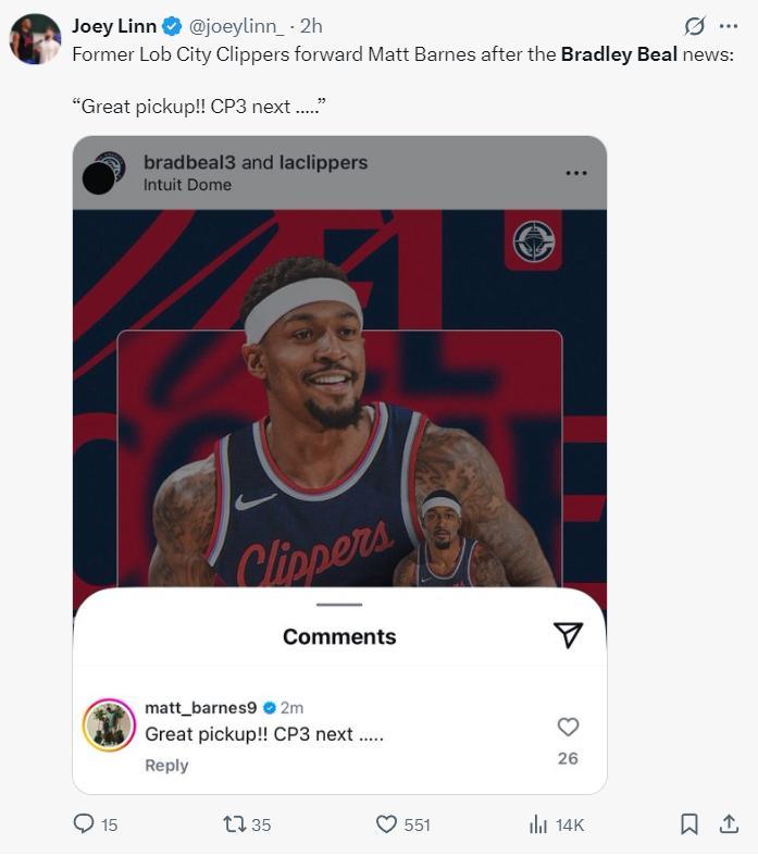 快船記者Joey Linn寫道:前快船球員馬特-巴恩斯在比爾正式簽約快船後表示可以坐等克里斯-保羅加盟了。