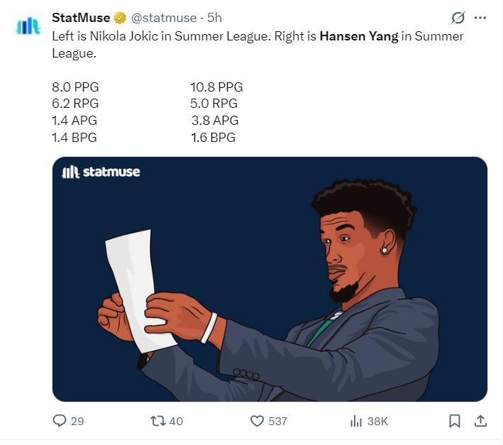 楊瀚森四場夏季聯賽的準確數據——場均24.5分鐘,得到10.8分、5.3籃板、3.8助攻、2.3蓋帽,投籃命中率45.7%,三分命中率33.3%,罰球命中率87.5%,小楊無愧中國約基奇。