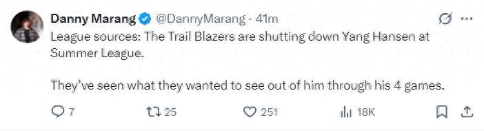 北京時間7月19日,開拓者隊記丹尼-馬朗報道,波特蘭開拓者隊決定讓楊瀚森在最後一場夏季聯賽中輪休,開拓者管理層已經從四場比賽中看到自己想看到的。