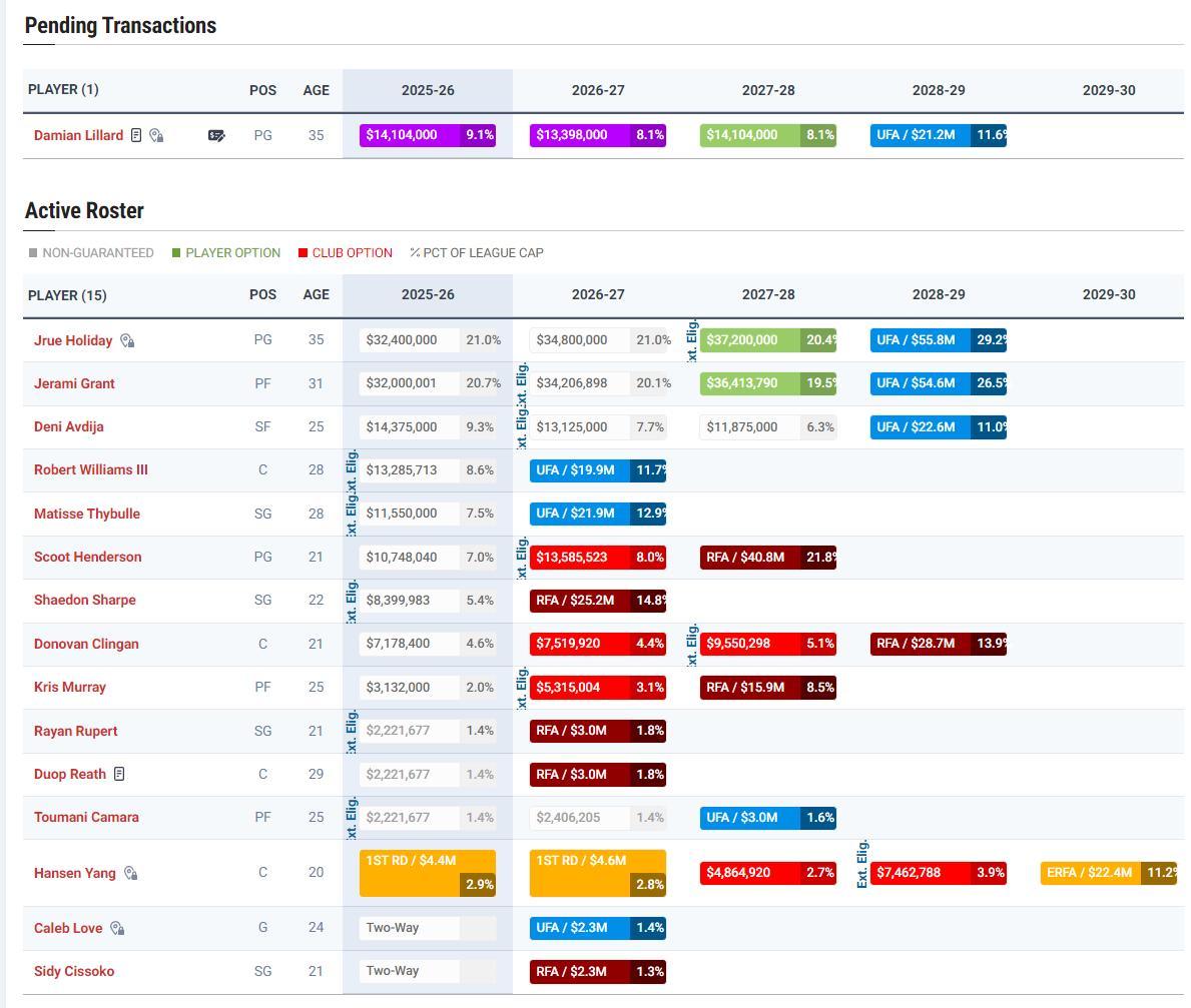 利拉德雖然迴歸撕裂之城但他整個25-26賽季實際上都是康復期,他與楊瀚森的搭檔要到26-27賽季纔會出現,不過利拉德簽約後開拓者的大名單已經更新爲14+2,這套陣容中有4箇中鋒,小楊要競爭主力輪換。
