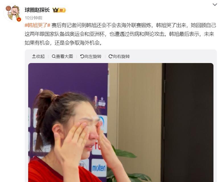 賽後韓旭在新聞發佈會上落淚了,記者詢問她未來會不會去海外聯賽鍛鍊,韓旭說“自己這兩年跟隨國家隊備戰奧運會、亞洲盃遭遇了傷病和輿論攻擊,如果未來有機會還是會去留洋。”