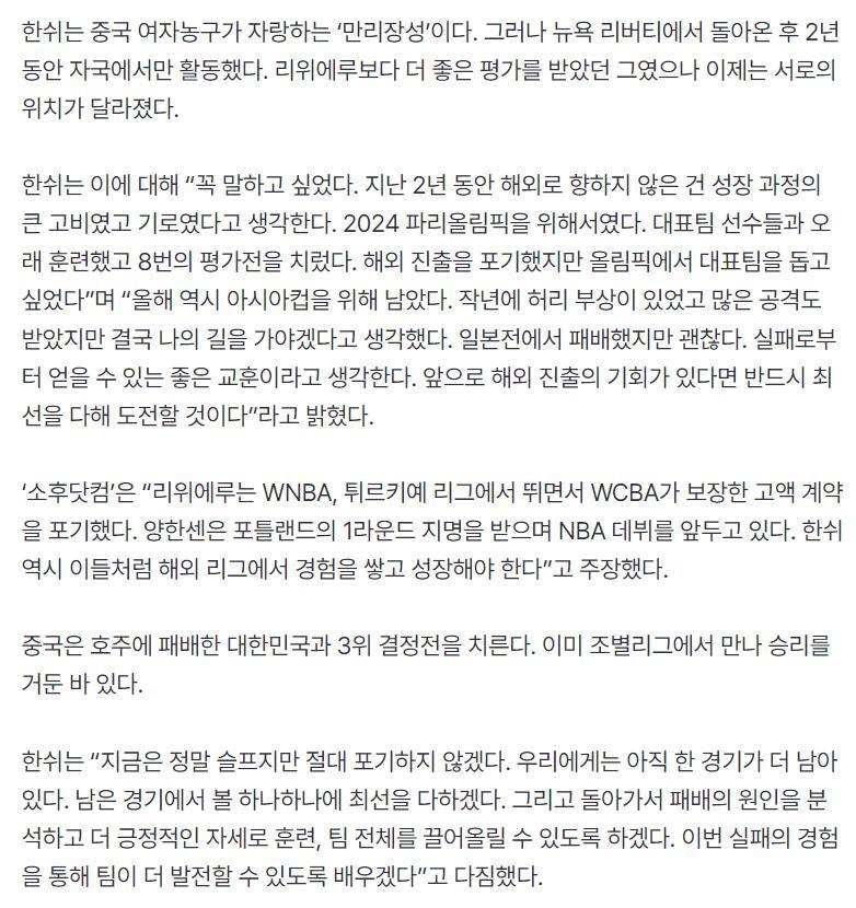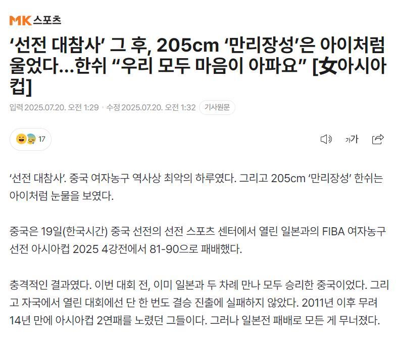 韓國女籃將是中國女籃3-4排位賽的對手,韓國媒體《MK》在北京時間7月20日凌晨撰文評價了中日之戰——“深圳大慘案後中國女籃205cm長城韓旭哭的像個孩子一樣,她說全隊都非常傷心。”